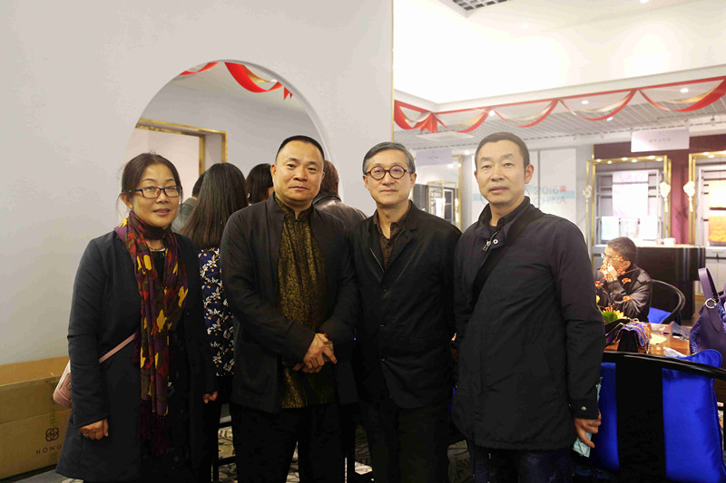 鼎盛絲綢董事長吳建華與江蘇省工藝美術(shù)大師、弄影時裝藝術(shù)顧問顧鳴、華藝品牌工廠直營中心總經(jīng)理徐清、蘇豪傳媒副總經(jīng)理單鳳艷合影。